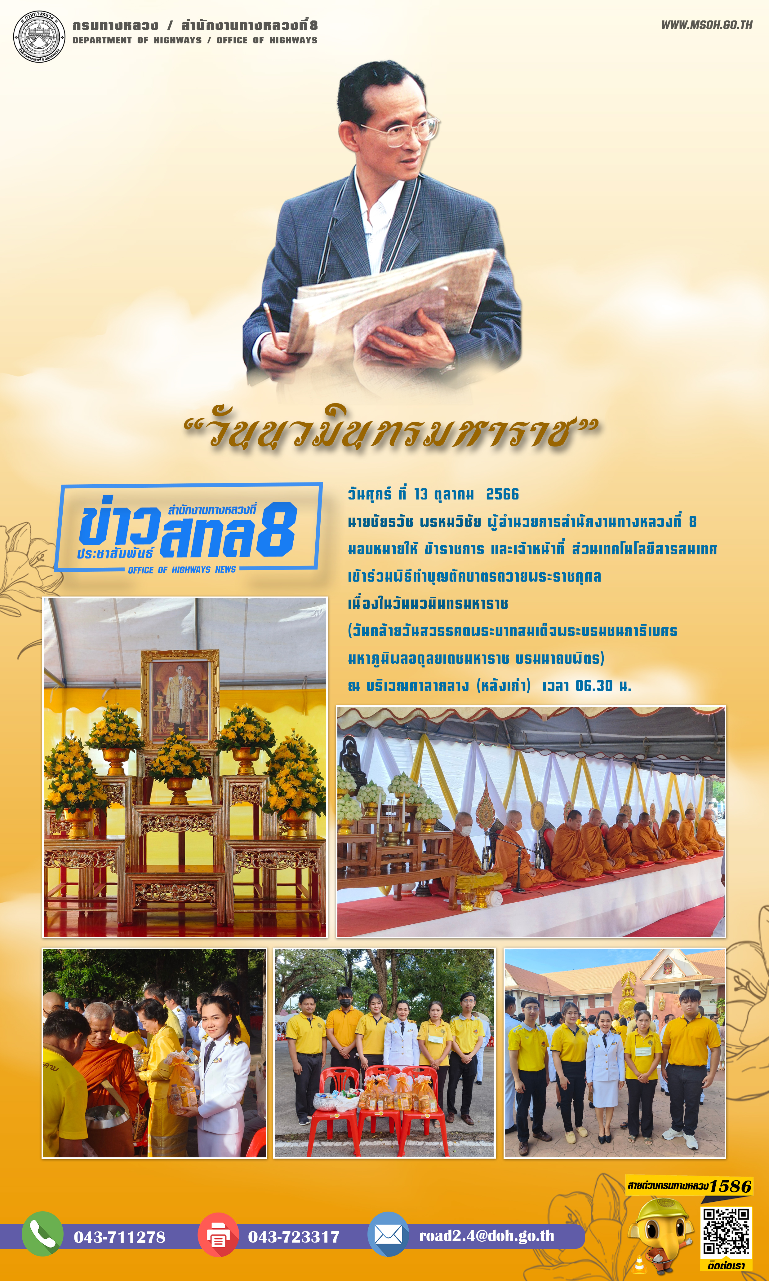 นายชัยธวัช พรหมวิชัย ผู้อำนวยการสำนักงานทางหลวงที่ 8 มอบหมายให้ ข้าราชการ และเจ้าหน้าที่ ส่วนเทคโนโลยีสารสนเทศ เข้าร่วมพิธีทำบุญตักบาตรถวายพระราชกุศล เนื่องในวันนวมินทรมหาราช