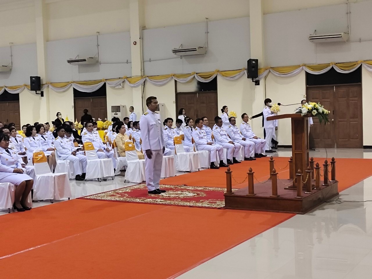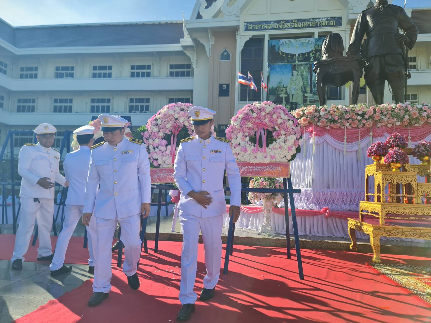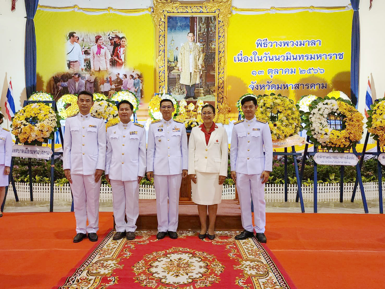 พิธีถวายพานพุ่มดอกไม้ถวายราชสักการะ และพิธีถวายบังคม เนื่องในวันคล้ายวันพระบรมราชสมภพพระบาทสมเด็จพระบรมชนกาธิเบศร มหาภูมิพลอดุลยเดชมหาราช บรมนาถบพิตร วันชาติ และวันพ่อแห่งชาติ ณ หอประชุมจังหวัดมหาสารคาม