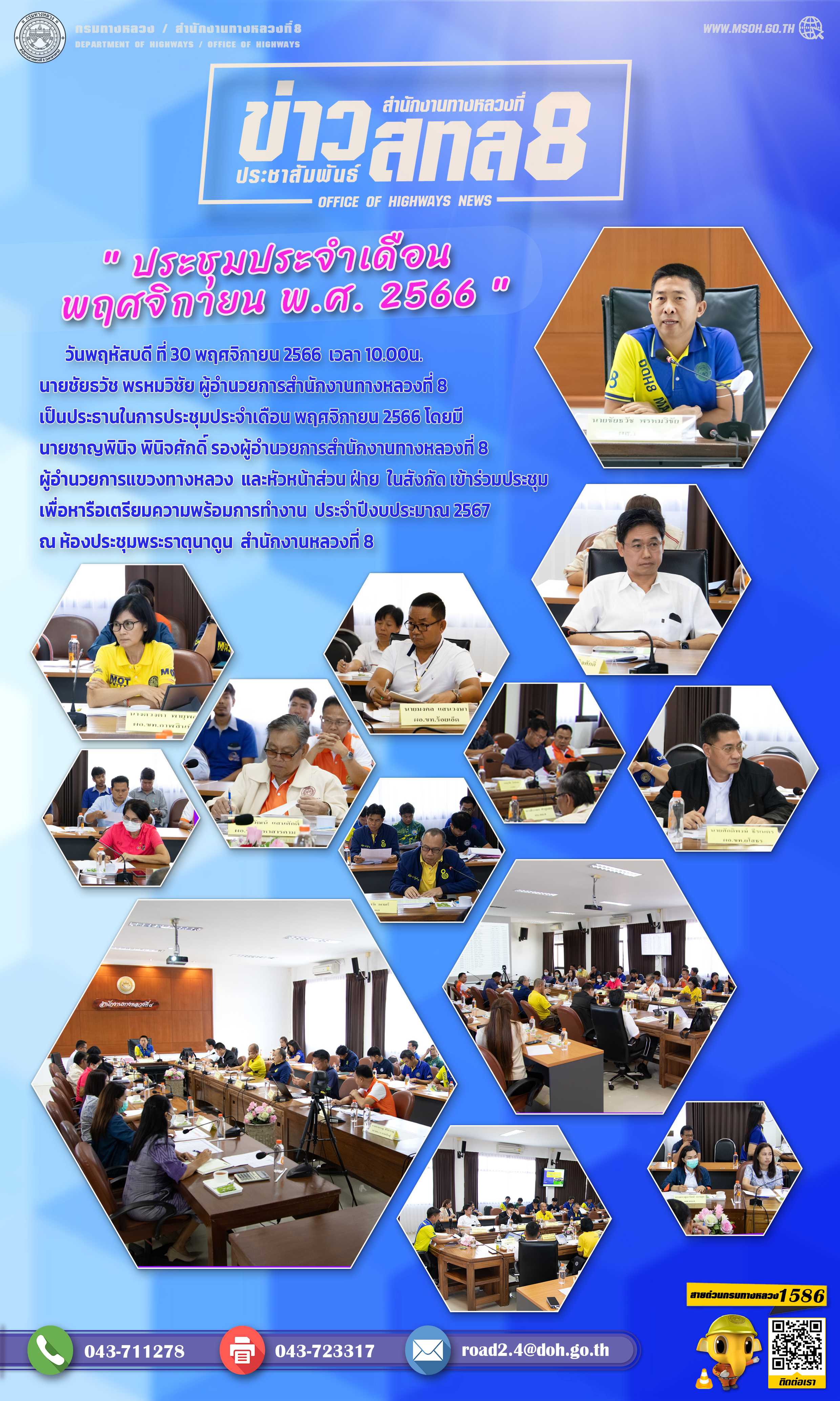 วันพฤหัสบดี ที่ 30 พฤศจิกายน 2566 เวลา 10.00น. นายชัยธวัช พรหมวิชัย ผู้อำนวยการสำนักงานทางหลวงที่ 8 เป็นประธานในการประชุมประจำเดือน พฤศจิกายน 2566 โดยมี นายชาญพินิจ พินิจศักดิ์ รองผู้อำนวยการสำนักงานทางหลวงที่ 8 ผู้อำนวยการแขวงทางหลวง และหัวหน้าส่วน ฝ่าย ในสังกัด เข้าร่วมประชุม เพื่อหารือเตรียมความพร้อมการทำงาน ประจำปีงบประมาณ 2567 ณ ห้องประชุมพระธาตุนาดูน สำนักงานหลวงที่ 8