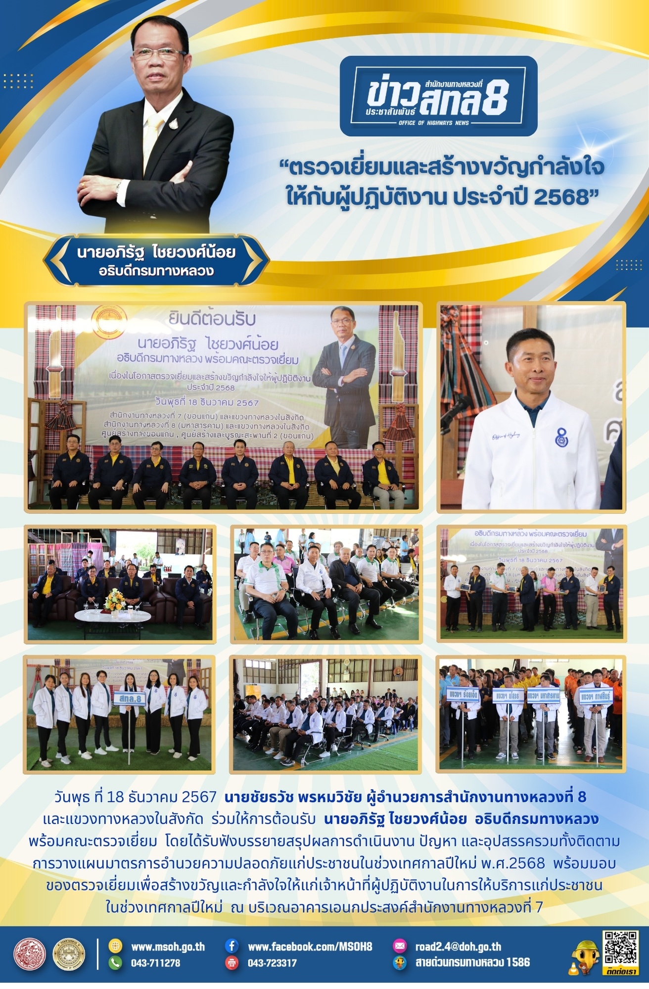 วันพุธ ที่ 18 ธันวาคม 2567 นายชัยธวัช พรหมวิชัย ผู้อำนวยการสำนักงานทางหลวงที่ 8 และแขวงทางหลวงในสังกัด ร่วมให้การต้อนรับ นายอภิรัฐ ไชยวงศ์น้อย อธิบดีกรมทางหลวง พร้อมคณะตรวจเยี่ยม โดยได้รับฟังบรรยายสรุปผลการดำเนินงาน ปัญหา และอุปสรรครวมทั้งติดตามการวางแผนมาตรการอำนวยความปลอดภัยแก่ประชาชนในช่วงเทศกาลปีใหม่ พ.ศ.2568 พร้อมมอบของตรวจเยี่ยมเพื่อสร้างขวัญและกำลังใจให้แก่เจ้าหน้าที่ผู้ปฏิบัติงานในการให้บริการแก่ประชาชนในช่วงเทศกาลปีใหม่ ณ บริเวณอาคารเอนกประสงค์สำนักงานทางหลวงที่ 7