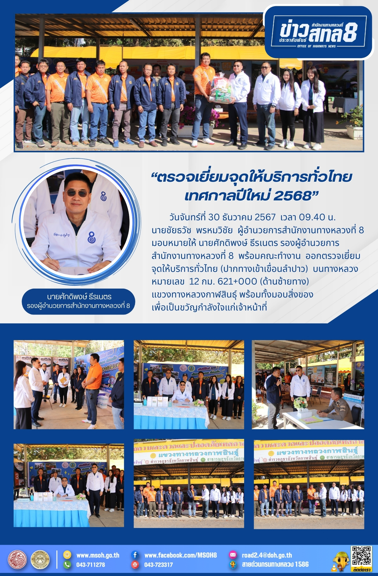 วันจันทร์ที่ 30 ธันวาคม 2567 เวลา 09.40 น. นายชัยธวัช พรหมวิชัย ผู้อำนวยการสำนักงานทางหลวงที่ 8 มอบหมายให้ นายศักดิพงษ์ ธีรเนตร รองผู้อำนวยการสำนักงานทางหลวงที่ 8พร้อมคณะทำงาน ออกตรวจเยี่ยมจุดให้บริการทั่วไทย (ปากทางเข้าเขื่อนลำปาว) บนทางหลวงหมายเลข 12 กม. 621+000 (ด้านซ้ายทาง) แขวงทางหลวงกาฬสินธุ์ พร้อมทั้งมอบสิ่งของเพื่อเป็นขวัญกำลังใจแก่เจ้าหน้าที่