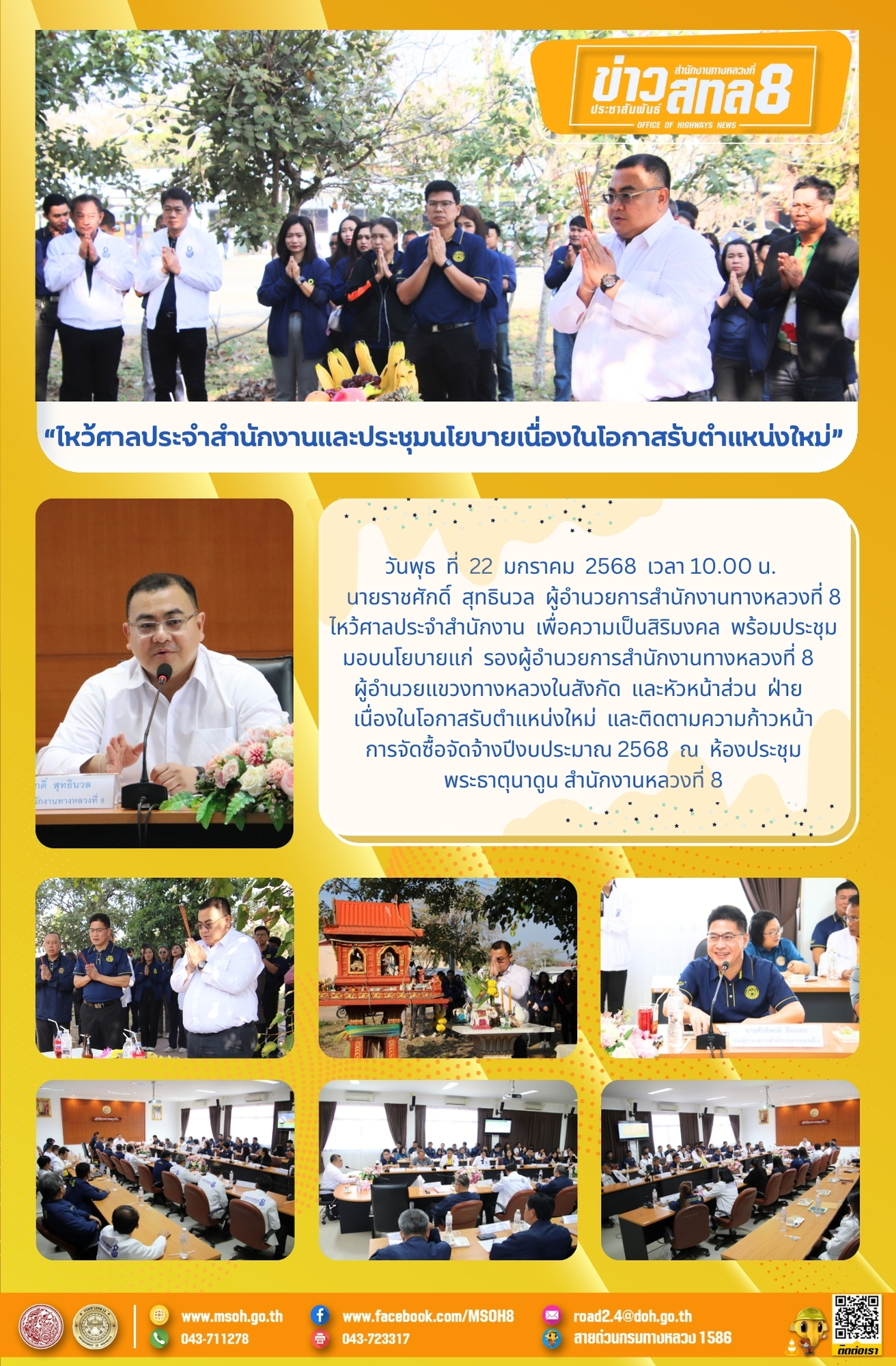 วันพุธ ที่ 22 มกราคม 2568 เวลา 10.00 น. นายราชศักดิ์ สุทธินวล ผู้อำนวยการสำนักงานทางหลวงที่ 8 ไหว้ศาลประจำสำนักงาน เพื่อความเป็นสิริมงคล พร้อมประชุมมอบนโยบายแก่ รองผู้อำนวยการสำนักงานทางหลวงที่ 8 ผู้อำนวยแขวงทางหลวงในสังกัด และหัวหน้าส่วน ฝ่าย เนื่องในโอกาสรับตำแหน่งใหม่ และติดตามความก้าวหน้า การจัดซื้อจัดจ้างปีงบประมาณ 2568 ณ ห้องประชุม พระธาตุนาดูน สำนักงานหลวงที่ 8