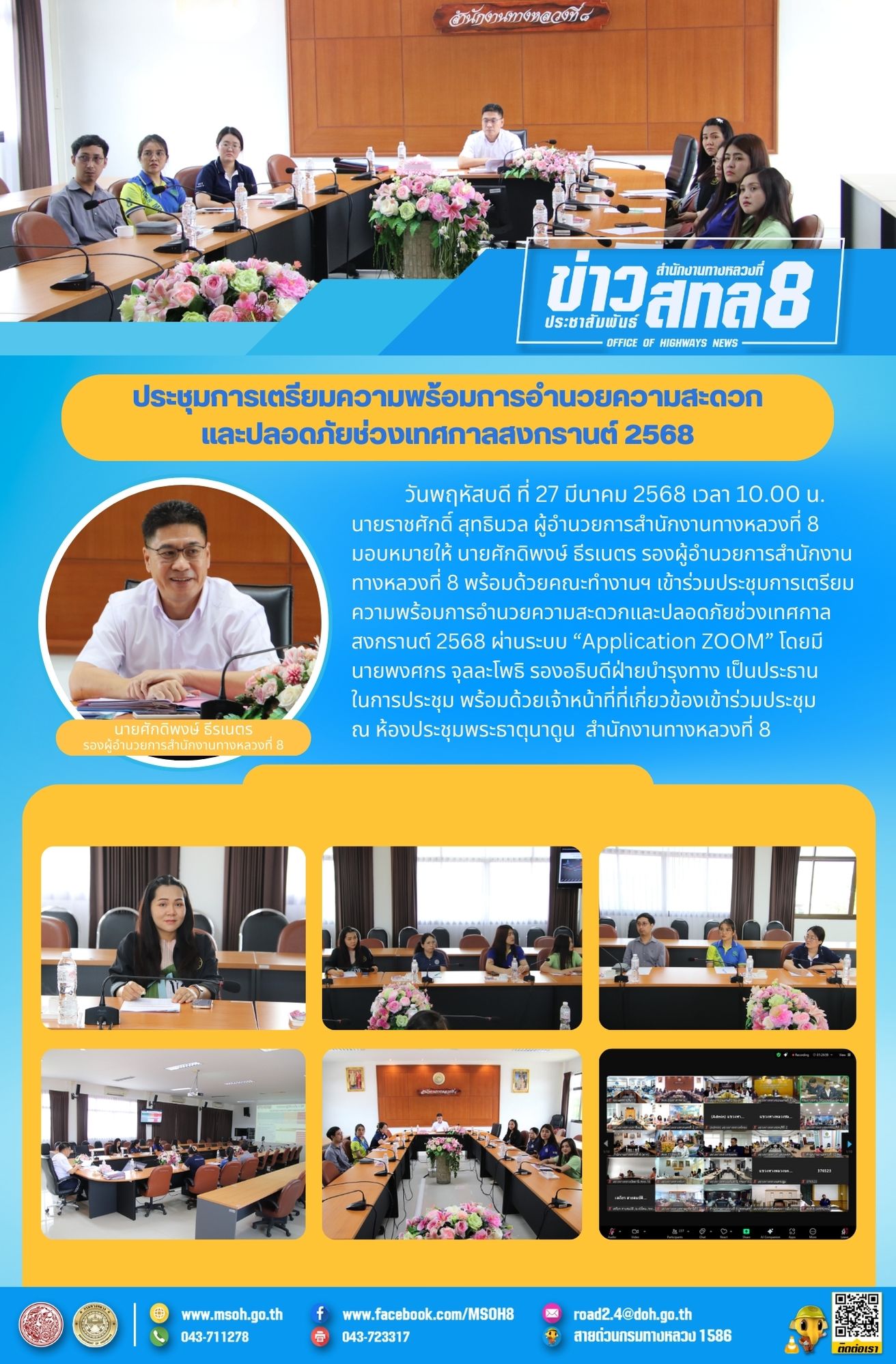 วันพฤหัสบดี ที่ 27 มีนาคม 2568 เวลา 10.00 น. นายราชศักดิ์ สุทธินวล ผู้อำนวยการสำนักงานทางหลวงที่ 8 มอบหมายให้ นายศักดิพงษ์ ธีรเนตร รองผู้อำนวยการสำนักงานทางหลวงที่ 8 พร้อมด้วยคณะทำงานฯ เข้าร่วมประชุมการเตรียมความพร้อมการอำนวยความสะดวกและปลอดภัยช่วงเทศกาลสงกรานต์ 2568 ผ่านระบบ “Application ZOOM” โดยมี นายพงศกร จุลละโพธิ รองอธิบดีฝ่ายบำรุงทาง เป็นประธานในการประชุม พร้อมด้วยเจ้าหน้าที่ที่เกี่ยวข้องเข้าร่วมประชุม ณ ห้องประชุมพระธาตุนาดูน สำนักงานทางหลวงที่ 8