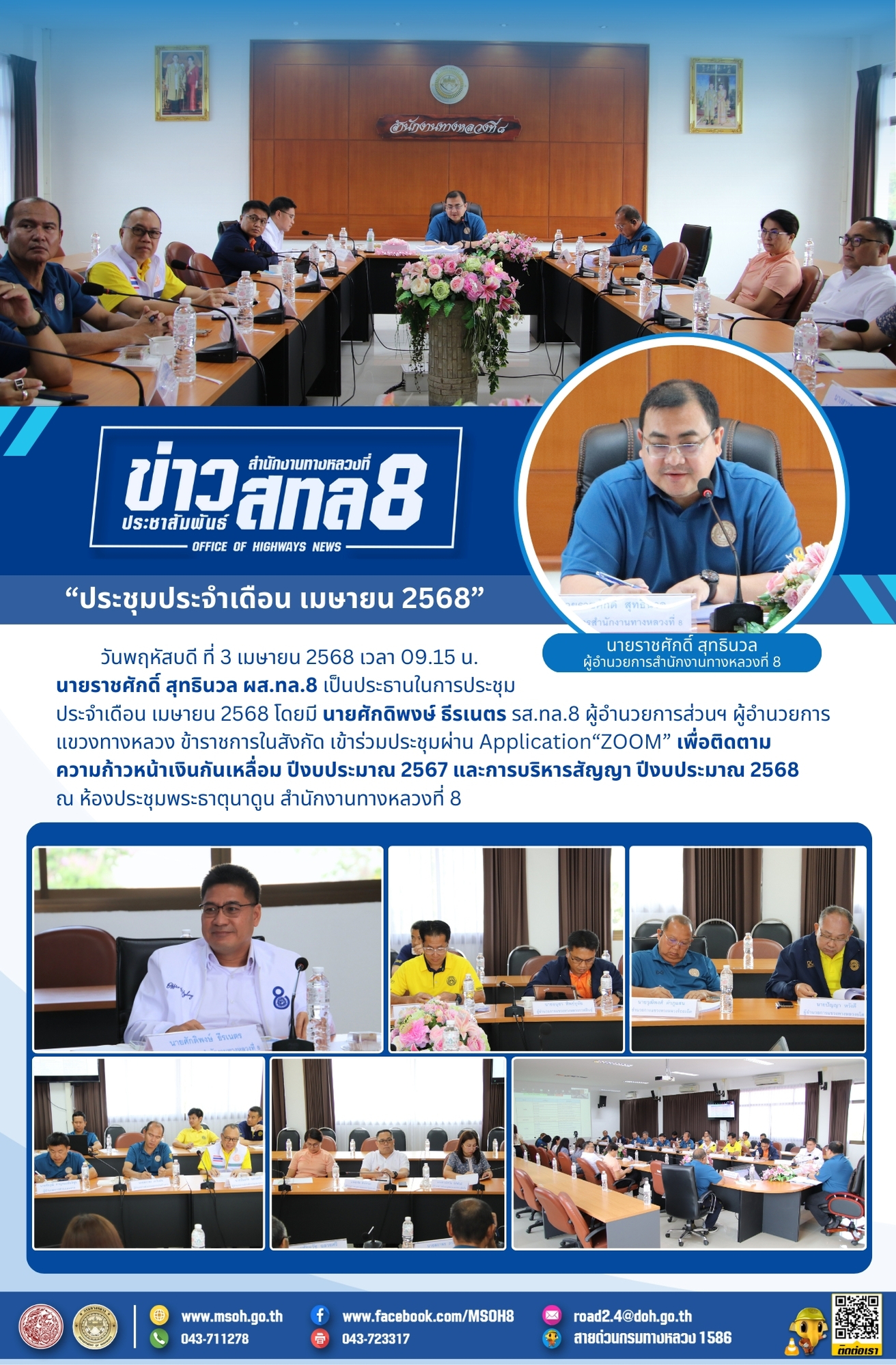 วันพฤหัสบดี ที่ 3 เมษายน 2568 เวลา 09.15 น. นายราชศักดิ์ สุทธินวล ผส.ทล.8 เป็นประธานในการประชุมประจำเดือน เมษายน 2568 โดยมี นายศักดิพงษ์ ธีรเนตร รส.ทล.8 ผู้อำนวยการส่วนฯ ผู้อำนวยการแขวงทางหลวง ข้าราชการในสังกัด เข้าร่วมประชุมผ่าน Application“ZOOM” เพื่อติดตาม