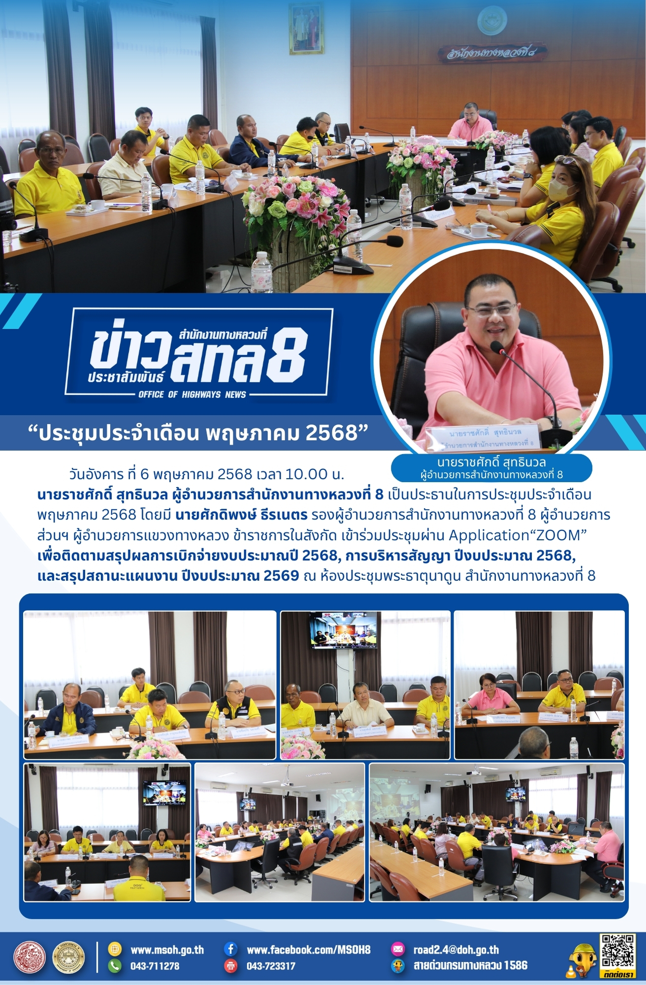 วันอังคาร ที่ 6 พฤษภาคม 2568 เวลา 10.00 น. นายราชศักดิ์ สุทธินวล ผู้อำนวยการสำนักงานทางหลวงที่ 8 เป็นประธานในการประชุมประจำเดือน พฤษภาคม 2568 โดยมี นายศักดิพงษ์ ธีรเนตร รองผู้อำนวยการสำนักงานทางหลวงที่ 8 ผู้อำนวยการส่วนฯ ผู้อำนวยการแขวงทางหลวง ข้าราชการในสังกัด เข้าร่วมประชุมผ่าน Application“ZOOM” เพื่อติดตามสรุปผลการเบิกจ่ายงบประมาณปี 2568, การบริหารสัญญา ปีงบประมาณ 2568, และสรุปสถานะแผนงาน ปีงบประมาณ 2569 ณ ห้องประชุมพระธาตุนาดูน สำนักงานทางหลวงที่ 8