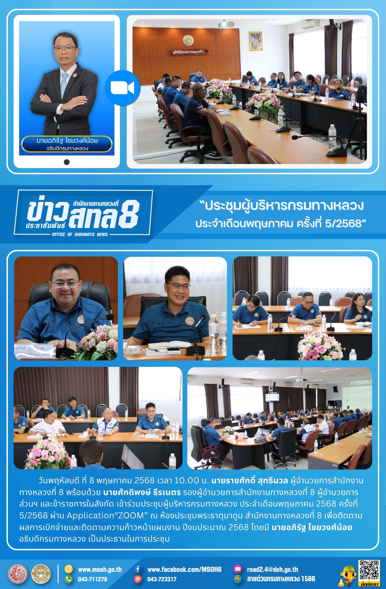 วันพฤหัสบดี ที่ 8 พฤษภาคม 2568 เวลา 10.00 น. นายราชศักดิ์ สุทธินวล ผู้อำนวยการสำนักงานทางหลวงที่ 8 พร้อมด้วย นายศักดิพงษ์ ธีรเนตร รองผู้อำนวยการสำนักงานทางหลวงที่ 8 ผู้อำนวยการส่วนฯ และข้าราชการในสังกัด เข้าร่วมประชุมผู้บริหารกรมทางหลวง ประจำเดือนพฤษภาคม 2568 ครั้งที่ 5/2568 ผ่าน Application“ZOOM” ณ ห้องประชุมพระธาตุนาดูน สำนักงานทางหลวงที่ 8 เพื่อติดตามผลการเบิกจ่ายและติดตามความก้าวหน้าแผนงาน ปีงบประมาณ 2568 โดยมี นายอภิรัฐ ไชยวงศ์น้อย อธิบดีกรมทางหลวง เป็นประธานในการประชุม
