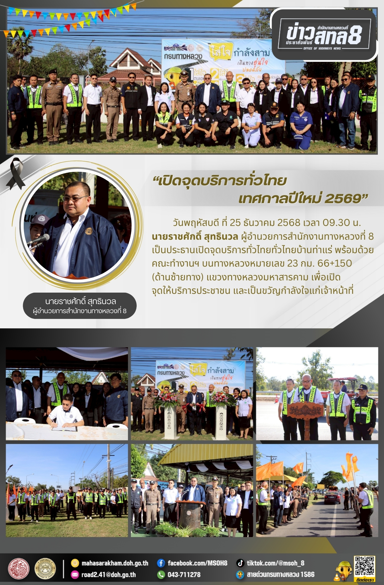วันพฤหัสบดี ที่ 25 ธันวาคม 2568 เวลา 09.30 น. นายราชศักดิ์ สุทธินวล ผู้อำนวยการสำนักงานทางหลวงที่ 8 เป็นประธานเปิดจุดบริการทั่วไทยทั่วไทยบ้านท่าแร่ พร้อมด้วยคณะทำงานฯ บนทางหลวงหมายเลข 23 กม. 66+150 (ด้านซ้ายทาง) แขวงทางหลวงมหาสารคาม เพื่อเปิดจุดให้บริการประชาชน และเป็นขวัญกำลังใจแก่เจ้าหน้าที่