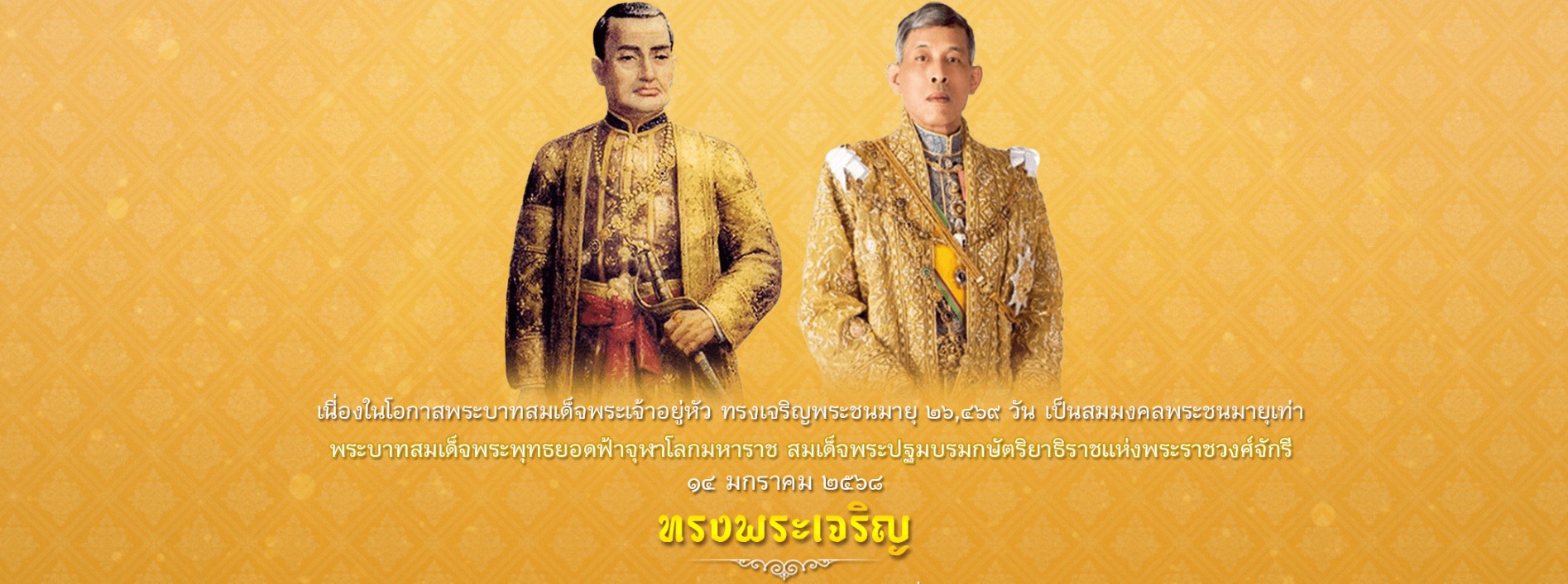 ขอเชิญร่วมลงนามถวายพระพร เนื่องในโอกาสพระบาทสมเด็จพระเจ้าอยู่หัว ทรงเจริญพระชนมายุ 26,469 วัน เป็นสมมงคลพระชนมายุเท่า พระบาทสมเด็จพระพุทธยอดฟ้าจุฬาโลกมหาราช สมเด็จพระปฐมบรมกษัตริยาธิราชแห่งพระราชวงศ์จักรี 14 มกราคม 2568