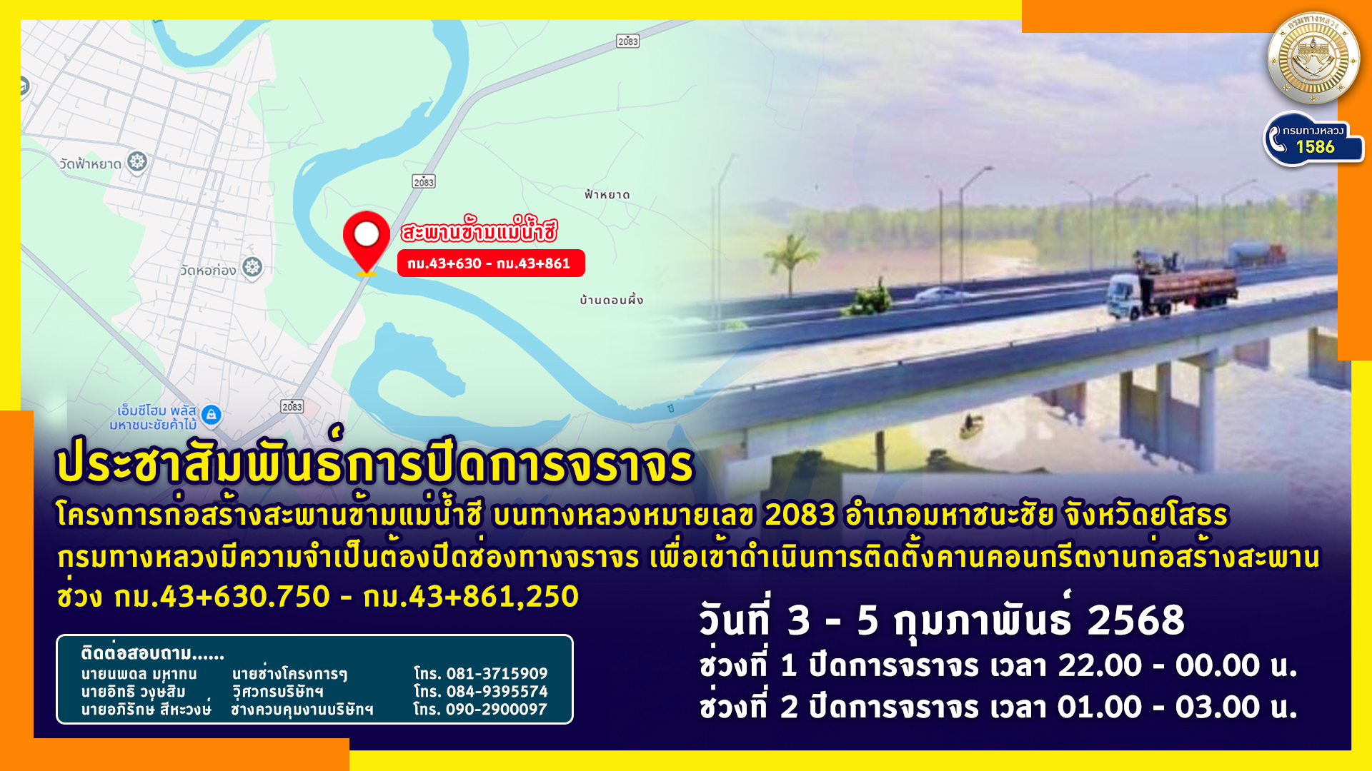 ประชาสัมพันธ์การปิดการจราจร โครงการก่อสร้างสะพานข้ามแม่น้ำชี บนทางหลวงหมายเลข 2083 อำเภอมหาชนะชัย จังหวัดยโสธร