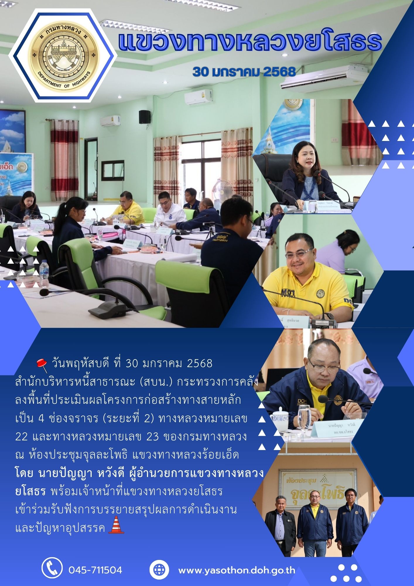 โดย นายปัญญา หวังดี ผู้อำนวยการแขวงทางหลวงยโสธร พร้อมเจ้าหน้าที่แขวงทางหลวงยโสธร เข้าร่วมรับฟังการบรรยายสรุปผลการดำเนินงานและปัญหาอุปสรรค ณ ห้องประชุมจุลละโพธิ แขวงทางหลวงร้อยเอ็ด